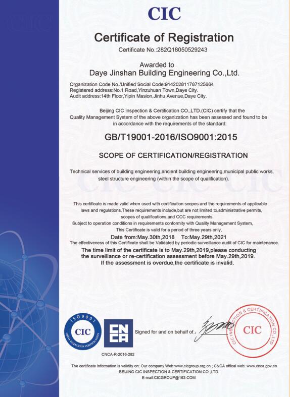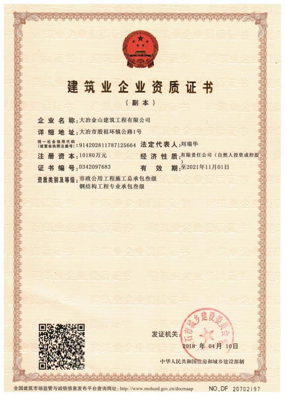 大冶金山建筑工程有限公司始建于1984年,屬鎮(zhèn)辦集體企業(yè)。1997年改制為大冶山建筑工程有限責(zé)任公司,屬股份制企業(yè)。2013年更名為大冶金山建筑工程有限公司,2018年3月公司資源重組,公司注冊(cè)資金達(dá)到10180.00萬(wàn)元,公司法定代表人為劉瑞華。公司具有古建筑工程專(zhuān)業(yè)承包壹級(jí)、建筑工程施工總承包貳級(jí)、市政工程總承包叁級(jí)、鋼結(jié)構(gòu)工程專(zhuān)業(yè)承包叁級(jí)資質(zhì)。